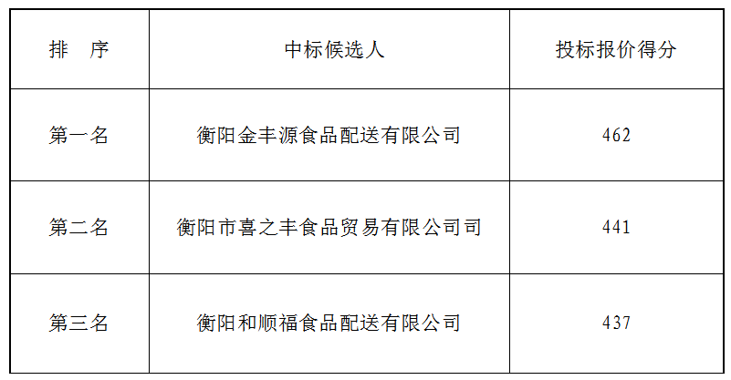 衡陽(yáng)市衡府賓館有限公司(養(yǎng)正園)食堂食材(肉類(lèi))于2021年1月27日上午9時(shí)00分(北京時(shí)間)進(jìn)行了比選開(kāi)標(biāo)、評(píng)標(biāo)活動(dòng),評(píng)標(biāo)小組按照招標(biāo)公告規(guī)定的評(píng)標(biāo)辦法及原則進(jìn)行評(píng)定,確定中標(biāo)候選人如下: