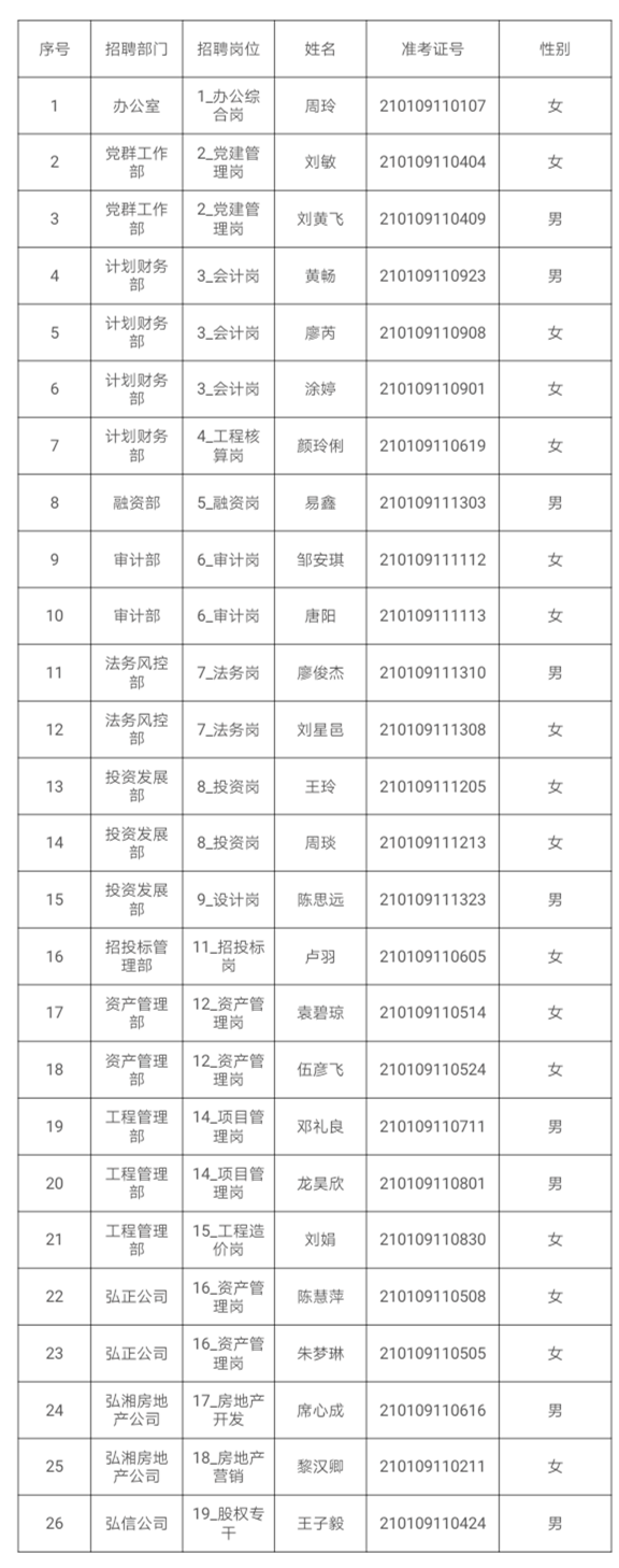 根據(jù)《衡陽(yáng)弘湘國(guó)有投資(控股)集團(tuán)有限公司2020年公開招聘員工公告》的規(guī)定,我司公開招聘員工按發(fā)布公告、報(bào)名、筆試、資格審查、面試、體檢、考察等程序,現(xiàn)確定26名擬聘用人員,并予以公示。
